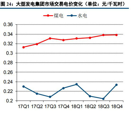從大型發(fā)電集團(tuán)的市場(chǎng)化交易電價(jià)變化趨勢(shì)來看,煤電及水電的交易電價(jià)整體趨勢(shì)向上。大型發(fā)電集團(tuán)2018年煤電市場(chǎng)交易(含跨區(qū)跨省市場(chǎng)交易)平均電價(jià)為0.3383元/千瓦時(shí),較上年提高0.0119元/千瓦時(shí);水電機(jī)組市場(chǎng)交易平均電價(jià)為0.2245元/千瓦時(shí),較上年提高0.0038元/千瓦時(shí)。