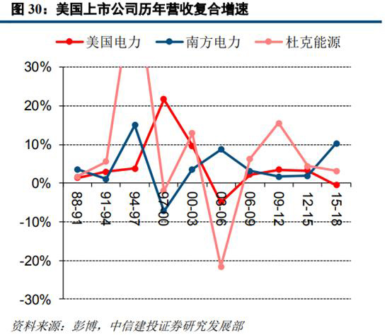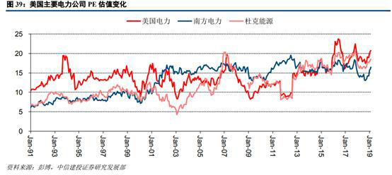 從美國(guó)電力等三家公司近三十年的PE估值水平來看,其估值波動(dòng)區(qū)間主要在10-20倍之間且呈現(xiàn)震蕩上行趨勢(shì)。我們將時(shí)間劃分為1991年-2001年、2001年-2011年及2011-2019年三個(gè)區(qū)間,美國(guó)電力、南方電力和杜克能源的平均PE分別為13.6/8.71/9.09、12.67/15.47/11.24、16.15/16.43/15.83,市盈率估值穩(wěn)步提升的趨勢(shì)較為明顯。