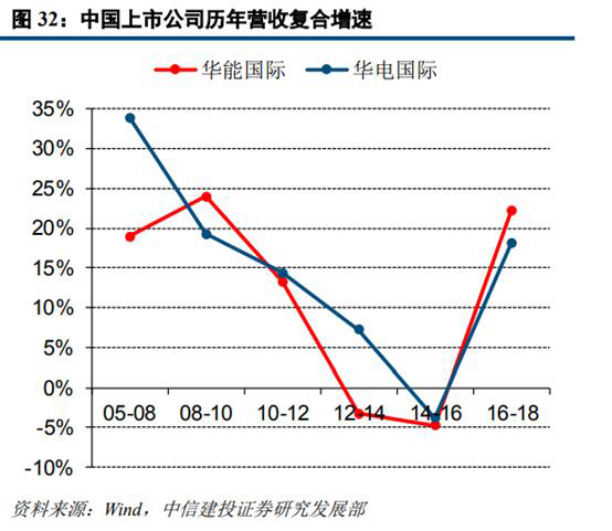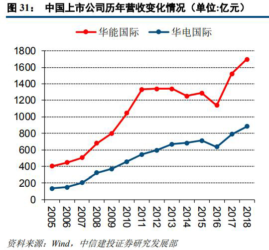 從營(yíng)收復(fù)合增速來看,從2005年至2016年華能國(guó)際與華電國(guó)際的營(yíng)收復(fù)合增速均處于下降通道。我們判斷主要是受我國(guó)發(fā)用電增速下臺(tái)階以及基數(shù)效應(yīng)影響所致。2016-2018年兩公司營(yíng)收復(fù)合增速觸底回升,主要受用電需求回暖、2017年7月份部分省份上調(diào)燃煤標(biāo)桿電價(jià)、新機(jī)組投產(chǎn)及資產(chǎn)注入等因素影響。