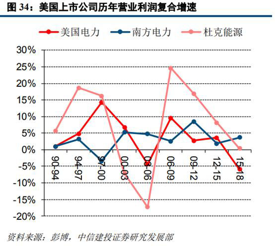 從美國(guó)上市公司的盈利情況來看,雖然年際間營(yíng)業(yè)利潤(rùn)情況有所波動(dòng),但整體仍保持穩(wěn)健提升的趨勢(shì)。自2011年之后,相關(guān)企業(yè)營(yíng)業(yè)利潤(rùn)及增速保持相對(duì)平穩(wěn),波動(dòng)幅度較之前的年份有所收窄。在前面我們對(duì)于美國(guó)電力市場(chǎng)化進(jìn)程及機(jī)制的分析中也可以看到,以PJM為代表的一系列區(qū)域輸電組織已形成了相對(duì)完備的電力市場(chǎng)化交易機(jī)制,通過長(zhǎng)期合約、期貨、現(xiàn)貨等一系列交易手段,電力的商品屬性及真實(shí)價(jià)格得到充分體現(xiàn)。發(fā)電企業(yè)可以依據(jù)電力供需格局及能源價(jià)格,合理調(diào)整發(fā)電側(cè)報(bào)價(jià),在一定程度上可以轉(zhuǎn)移燃料成本波動(dòng)對(duì)于自身盈利能力的沖擊影響。