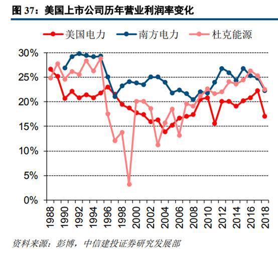 從中美上市火電公司的營(yíng)業(yè)利潤(rùn)率對(duì)比也可以看出,美國(guó)上市電力公司近年來營(yíng)業(yè)利潤(rùn)率穩(wěn)定在20%—25%之間,歷史波動(dòng)幅度也窄于中國(guó)上市電力公司。這也進(jìn)一步佐證了美國(guó)火電公司盈利穩(wěn)定性高于中國(guó)火電公司的判斷。