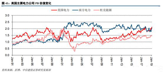 從市凈率角度來看,美國(guó)電力等三家美國(guó)公司的PB估值也有所提升,但增長(zhǎng)節(jié)奏與PE有所出入。我們將時(shí)間劃分為1991年~2001年、2001年~2011年及2011~2019年三個(gè)區(qū)間,美國(guó)電力、南方電力和杜克能源的平均PB分別為1.58/1.11/1.25、1.49/2.15/1.00、1.62/2.05/1.29。南方電力的PB估值在2001后有所躍升,而美國(guó)電力及杜克能源增長(zhǎng)相對(duì)不太明顯。