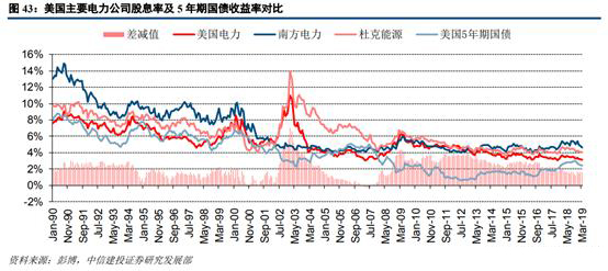 從美國(guó)主要電力公司股息率趨勢(shì)來看,其股息率整體震蕩下行,與美國(guó)5年期國(guó)債收益率趨勢(shì)較為一致。近年來三家公司股息率均值減去國(guó)債收益率的差減值相對(duì)穩(wěn)定,我們判斷相關(guān)公司估值中樞上移有較大因素是受無風(fēng)險(xiǎn)利率下行推動(dòng)所致。
