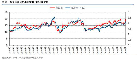 為了剔除公司層面偶然事件的影響,我們進(jìn)一步對(duì)比中美電力行業(yè)指數(shù)的估值情況。我們選擇標(biāo)普500的公用事業(yè)指數(shù)和中信火電行業(yè)指數(shù)進(jìn)行對(duì)比分析。從標(biāo)普500公用事業(yè)指數(shù)來看,其PE及PB波動(dòng)幅度較為一致,說明此指數(shù)相應(yīng)的ROE也較為穩(wěn)定,基本上在8%—10%之間。2015年后指數(shù)的估值中樞有所上移,PE及PB的中位數(shù)分別為17.26倍和1.89倍。
