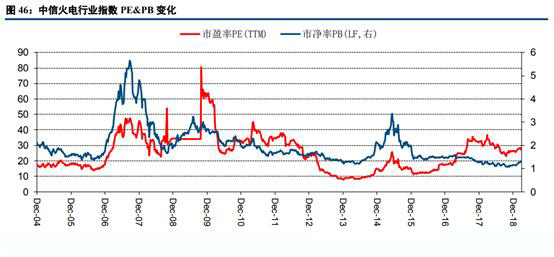 從華能國(guó)際和華電國(guó)際的近年P(guān)E估值情況來看,兩公司估值區(qū)間波動(dòng)較大。由于我國(guó)火力發(fā)電企業(yè)受“市場(chǎng)煤計(jì)劃電”影響,其盈利能力受煤價(jià)影響呈現(xiàn)大幅波動(dòng),從而導(dǎo)致PE波動(dòng)較大。在煤價(jià)較高的時(shí)間點(diǎn)(2008年、2011年、2017年等),兩公司的PE呈現(xiàn)不正常的上下波動(dòng),基本上不具備估值參考的意義。從這個(gè)角度來看,當(dāng)前我國(guó)火電尚未能完全體現(xiàn)出公用事業(yè)板塊的特點(diǎn),更多的表現(xiàn)出逆周期的特質(zhì)。