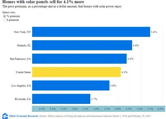 太陽能住宅的銷量隨地區(qū)不同而變化:例如,紐約5.4%,舊金山4.4%,洛杉磯3.6%。Zillow的數(shù)據(jù)來源于在2018年3月1日至2019年2月28日期間出售房屋的報告。