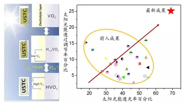 他們因此發(fā)展了電場調(diào)節(jié)的技術(shù),根據(jù)計算獲得的加入不同濃度氫原子的能量要求,以不同的電壓驅(qū)動材料加氫。最終他們成功開發(fā)了一種在室溫下利用固態(tài)電解質(zhì)施加很低的正反向偏壓就能夠可逆的調(diào)控加氫濃度的二氧化釩材料,它對太陽光譜中紅外光的調(diào)制能力達到了26.5%,并且實現(xiàn)了高達70%以上的可見光透過率。