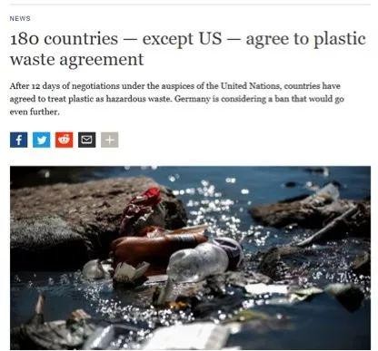 德國之聲的標(biāo)題也很直接:“180個國家——除了美國,都同意控制塑料垃圾的協(xié)議”。