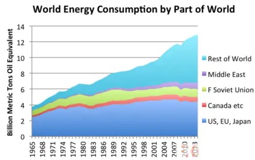 二戰(zhàn)之前,人類對資源、能源等生存必需品的爭奪、分配。除了合理社會構(gòu)架之外,還有大規(guī)模的的戰(zhàn)爭。而戰(zhàn)爭技術(shù)發(fā)展到核武器的級別,因戰(zhàn)爭的支出遠(yuǎn)比獲得要少,使得戰(zhàn)爭無法再成為能源分配的方式。相對和平的環(huán)境,地球上的人口迅速增長,能源需求矛盾凸顯。
