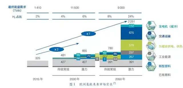 近期,歐洲燃料電池和氫能事業(yè)聯(lián)合組織(FCHJU)發(fā)布了“歐洲氫能路線圖”(圖 1)。該路線圖提出了歐洲氫能未來 30 年的發(fā)展規(guī)劃,并得到歐洲 17 家氫能公司和組織的支持。該報(bào)告認(rèn)為,氫是歐洲能源轉(zhuǎn)型的重要元素,到 2050 年可占最終能源需求的 24% 并提供 540 萬個(gè)工作崗位。為了實(shí)現(xiàn)歐洲二氧化碳減排目標(biāo),必須發(fā)展氫能。對(duì)于諸如天然氣網(wǎng)、運(yùn)輸(特別是重型車輛)關(guān)鍵部分的規(guī)模脫碳、高級(jí)燃料和化學(xué)原料需要大量使用氫氣。此外,氫氣可以解決大規(guī)模整合可再生能源以及實(shí)現(xiàn)低成本季節(jié)性儲(chǔ)能和跨區(qū)域有效清潔能源運(yùn)輸中的技術(shù)難題。報(bào)告認(rèn)為,到 2050 年,氫能將在各個(gè)領(lǐng)域發(fā)揮重要作用,并為了實(shí)現(xiàn)歐洲 2050 年氫能產(chǎn)業(yè)目標(biāo),設(shè)置了短期和中期目標(biāo)。報(bào)告預(yù)測(cè),到 2050 年,歐洲 10%—18% 建筑的供暖和供電可以由氫能提供;工業(yè)中 23% 的高級(jí)熱能可由氫能提供。報(bào)告指出,氫能的使用將帶來巨大的社會(huì)、經(jīng)濟(jì)和環(huán)境效益。到 2030 年,氫能的預(yù)計(jì)部署將為歐盟公司的燃料和相關(guān)設(shè)備創(chuàng)造約 1 300 億歐元的產(chǎn)業(yè);到 2050 年達(dá)到 8 200 億歐元。氫能將為歐盟工業(yè)創(chuàng)造一個(gè)本地市場(chǎng),作為在全球氫能經(jīng)濟(jì)中競(jìng)爭(zhēng)的跳板。2030 年的出口潛力估計(jì)將達(dá)到 700 億歐元,凈出口額將達(dá)到 500 億歐元。
