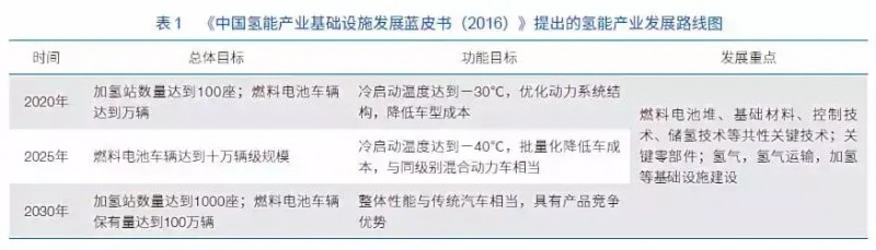 在氫能和燃料電池發(fā)展方面,我國(guó)也一直不落后。2016 年 10 月,中國(guó)標(biāo)準(zhǔn)化研究院資源與環(huán)境分院和中國(guó)電器工業(yè)協(xié)會(huì)發(fā)布的《中國(guó)氫能產(chǎn)業(yè)基礎(chǔ)設(shè)施發(fā)展藍(lán)皮書(2016)》首次提出了我國(guó)氫能產(chǎn)業(yè)的發(fā)展路線圖(表 1)。對(duì)我國(guó)中長(zhǎng)期加氫站和燃料電池車輛發(fā)展目標(biāo)進(jìn)行了規(guī)劃?!吨袊?guó)制造 2025》明確提出燃料電池汽車發(fā)展規(guī)劃,更是將發(fā)展氫燃料電池提升到了戰(zhàn)略高度。目前不論是國(guó)內(nèi)的氫能技術(shù),還是氫能產(chǎn)業(yè)基礎(chǔ),雖然都具有一定的戰(zhàn)略規(guī)模,但是與國(guó)際最先進(jìn)水平還有一定的差距。