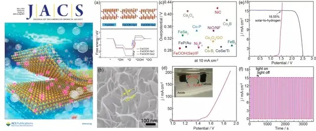 因與析氧反應(yīng)中間物種合適的吸脫附能力,鎳和鈷通常是高性能OER催化劑必不可少的組分。雖然鐵元素遠(yuǎn)比鎳與鈷儲量豐富,價格低廉得多,但目前鐵基催化劑析氧性能遠(yuǎn)低于鎳與鈷基材料。研究人員首先借助理論計算揭示非金屬Se摻雜可以顯著改善全鐵基FeOOH催化劑的電化學(xué)析氧決速步驟。基于此,發(fā)展了一種簡便的原位電化學(xué)活化策略,通過在OER條件下將三維導(dǎo)電低成本泡沫鐵基底上原位生長的FeSe垂直納米片陣列原位電化學(xué)活化轉(zhuǎn)化為Se摻雜的FeOOH納米片陣列,使該全鐵基催化劑同時具有高本征活性位點和高的電化學(xué)活性面積,因此表現(xiàn)出與全鎳或全鈷催化劑性能相當(dāng)?shù)腛ER電催化活性。該策略同樣適用于少量鎳摻雜的富鐵催化劑的制備,使少量鎳(3.3 at%)摻雜的富鐵催化劑可以實現(xiàn)與最佳富鎳或富鈷催化劑相媲美的電催化OER性能。在電流密度500 mA cm-2時的過電位僅需348 mV,并具有優(yōu)異的穩(wěn)定性。將該催化劑應(yīng)用于電解水裝置,電流密度50 mA cm-2時的槽壓僅需1.62V。在實際太陽光驅(qū)動的水分解系統(tǒng)中,所述催化劑實現(xiàn)了18.55%的太陽光到氫氣的最高轉(zhuǎn)換效率之一。這些結(jié)果表明所述策略為開發(fā)新的儲量豐富、經(jīng)濟(jì)、高效的電解水電催化劑提供了一種可能的途徑。