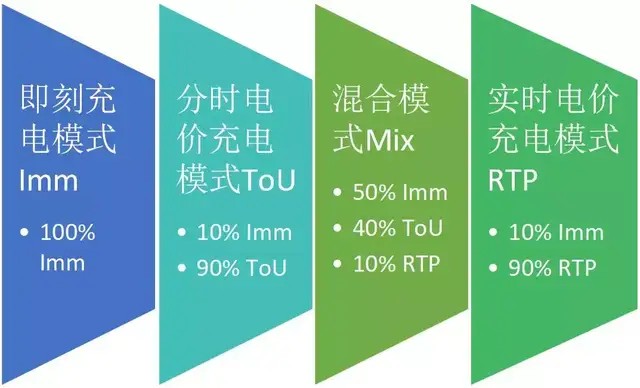 電動(dòng)車充電模式可分為四種:即刻充電模式(Immediatescenario,Imm)、分時(shí)電價(jià)充電模式(Time-of-use,ToU)、實(shí)時(shí)電價(jià)充電模式(RealtimePrice,RTP)和混合充電模式(Mix)。即刻充電模式也就是電動(dòng)車什么時(shí)候到什么時(shí)候充電的模式,是一種隨意行為模式。分時(shí)電價(jià)充電模式和實(shí)時(shí)電價(jià)充電模式則運(yùn)用了電價(jià)激勵(lì)措施改變了人們的充電行為。分時(shí)電價(jià)充電模式將引導(dǎo)人們按照靜態(tài)的固定價(jià)格表在時(shí)間允許范圍內(nèi)最低電價(jià)時(shí)充電。實(shí)時(shí)電價(jià)充電模式將按照隨每小時(shí)不停變化的實(shí)時(shí)電價(jià)引導(dǎo)人們?cè)跁r(shí)間允許范圍內(nèi)最低電價(jià)時(shí)充電。在實(shí)際運(yùn)行過程中,考慮到電動(dòng)車必須在到達(dá)充電樁和離開充電樁之間充電,分時(shí)電價(jià)充電模式和實(shí)時(shí)電價(jià)充電模式下,仍然會(huì)有即刻充電的存在。