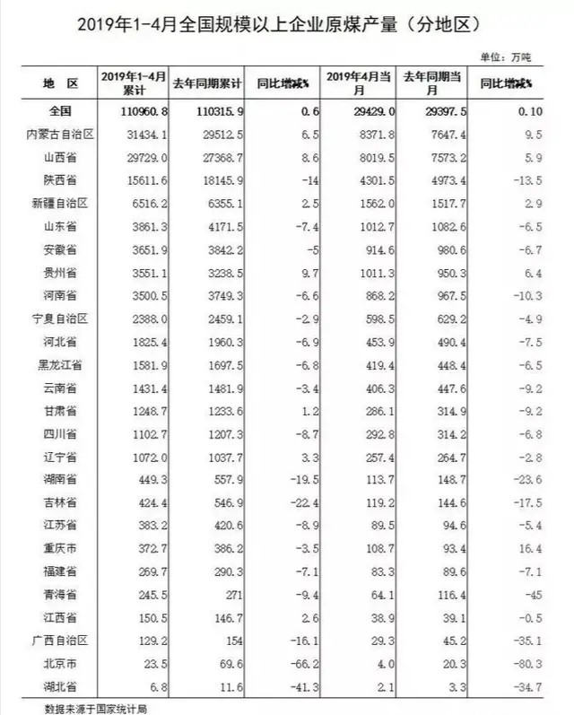 CCTD | 2019年1-4月份全國(guó)分省區(qū)原煤產(chǎn)量排名