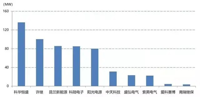 其中,2018年中國新增投運的電化學(xué)儲能項目中,裝機規(guī)模排名前十位的儲能逆變器提供商,依次為:科華恒盛、許繼、昆蘭新能源、科陸電子、陽光電源、中天科技、盛弘電氣、索英電氣、愛科賽博和南瑞繼保。
