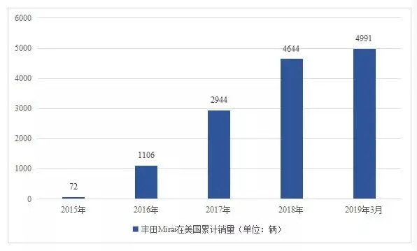 在這其中,銷量最大的當(dāng)屬豐田的Mirai氫燃料電池乘用車,自2015年10月21日起,豐田在美國加州開始銷售Mirai,該車型就成為全美最暢銷氫燃料電池汽車,截至2019年4月1日,Mirai累計在美國已銷售4991輛,占據(jù)了美國燃料電池乘用車銷量的80%左右。