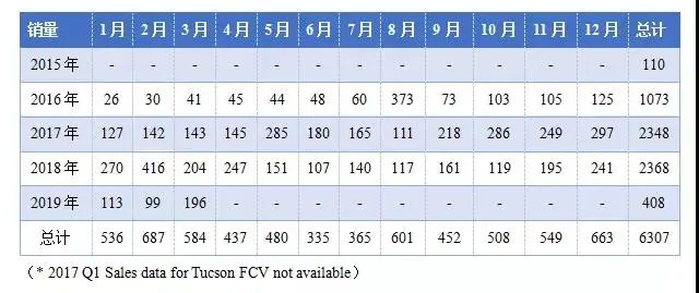 表4.全美氫燃料電池乘用車?yán)塾嬩N量(截至2019年3月底) 資料來源:Hyundai Tucson FCV data from HybridCars.com;Toyota Mirai, Honda Clarity, and Hyundai NEXO data from carsalesbase.com & Baum and Associates;香橙會研究院整理
