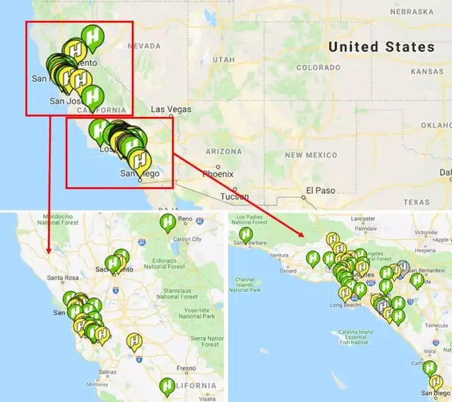 圖1.美國加州——零售加氫站分布圖 資料來源:California Fuel Cell Partnership,香橙會研究院