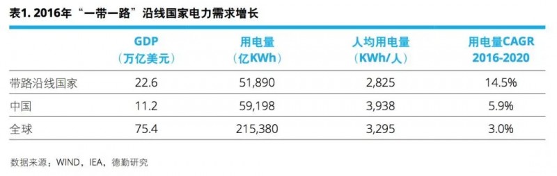 帶路沿線國家電力需求持續(xù)高速增長?!耙粠б宦贰蹦壳案采w國家總?cè)丝?6億,人均用電量約為2,825千瓦時(shí),遠(yuǎn)低于國際水平的3,295千瓦時(shí)1。未來帶路沿線國家的電力需求會保持高速增長,2016年帶路沿線國家發(fā)電量約為51,890億千瓦時(shí),2020年預(yù)測發(fā)電量將比2016年增長70%。