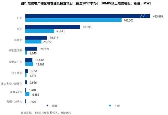 首先,大量煤電項(xiàng)目被擱置。2017年1月與2016年同期相比,全球開工前及規(guī)劃中燃煤電廠裝機(jī)下降48%,在建項(xiàng)目裝機(jī)下降19%,而擱置項(xiàng)目為同期的164%(圖1)。截至2017年7月,全球30MW以上煤電項(xiàng)目有6億千瓦裝機(jī)被擱置,占煤電總裝機(jī)規(guī)劃的42%。在東亞,4.2億千瓦煤電裝機(jī)被擱置,中國和日本限制燃煤電廠為主要原因。中國企業(yè)煤電海外投資的主要地區(qū),如南亞和東南亞也有大量項(xiàng)目被擱置目錄(圖2)。碳約束、融資缺口、投資環(huán)境、水資源壓力都成為燃煤電站擱置的原因。