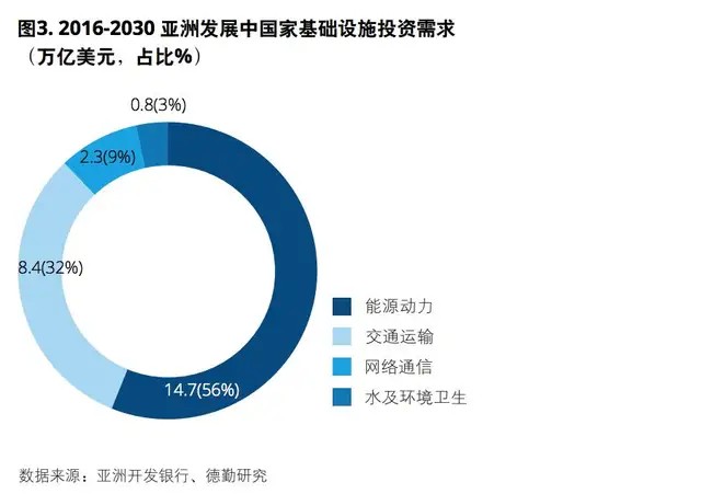 據(jù)亞洲開發(fā)銀行2017年預(yù)測,從2016年到2030年,亞洲發(fā)展中國家的基礎(chǔ)設(shè)施建設(shè)投資需求總額達(dá)到26萬億美元,其中14.7萬億美元(占比56%)為能源動力投資需求(圖3)。按照這個(gè)預(yù)測,亞洲國家每年均基礎(chǔ)設(shè)施投資需求為1.7萬億,遠(yuǎn)遠(yuǎn)高于現(xiàn)在近9,000億美元的投資水平。8