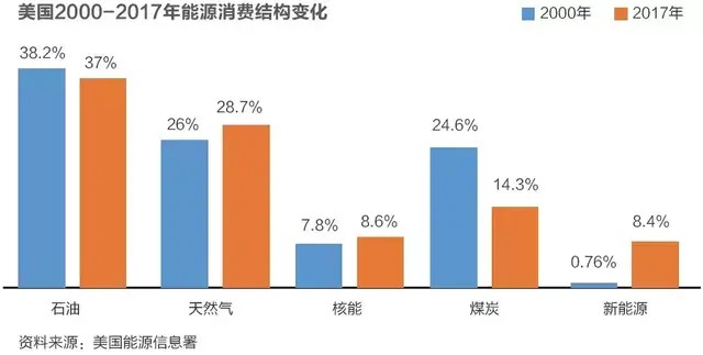 簡而言之,美國能源轉(zhuǎn)型的特點(diǎn)是:穩(wěn)油、增氣、減煤、穩(wěn)核、大力發(fā)展可再生能源。數(shù)據(jù)顯示,2000-2017年間,美國天然氣消費(fèi)占一次能源消費(fèi)的比重從26%增加到28.7%;石油消費(fèi)基本保持平穩(wěn)態(tài)勢,份額從38.2%略降至37%;核能份額從7.8%增加到8.6%;可再生能源份額從0.76%快速增長至8.4%,增加接近8個百分點(diǎn)。煤炭份額則從24.6%下降到14.3%,同比降低接近10個百分點(diǎn),成為最大“輸家”。