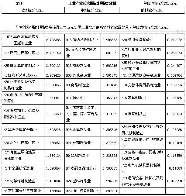 我們把實際能源消耗強度在1噸標準煤/萬元以上的行業(yè)作為高耗能產(chǎn)業(yè)組,在1噸標準煤/萬元以下的工業(yè)行業(yè)作為中低耗能產(chǎn)業(yè)組,而本文將主要針對高耗能產(chǎn)業(yè)組進行分析。由表1可以看出,高耗能產(chǎn)業(yè)組所涵蓋的產(chǎn)業(yè)和一般意義上所認為的高耗能產(chǎn)業(yè)基本一致。H26黑色金屬冶煉及壓延加工業(yè)實際能耗強度達到2.73,每萬元工業(yè)總產(chǎn)值消耗的能源最高;H37燃氣生產(chǎn)和供應業(yè)、H25非金屬礦物制品業(yè)、H1煤炭開采和洗選業(yè)的實際能耗強度達到了2.2以上;電力、有色金屬、非金屬、石油化工和化學纖維制造這些典型的高耗能產(chǎn)業(yè)實際能耗強度也均在1以上。