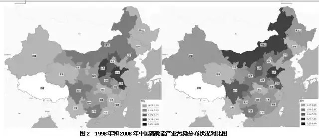從圖1可以非常清晰地看到中國高耗能產(chǎn)業(yè)在1998~2008年間的集聚和轉移過程。我們根據(jù)高耗能產(chǎn)業(yè)工業(yè)集聚度的大小將30個省區(qū)平均劃分為五個等級,左右兩圖(左圖為1998年,右圖為2008年)劃分標準一致,詳見圖例。圖中顏色最深的區(qū)域即是高耗能產(chǎn)業(yè)分布密集程度最高的地區(qū),而隨著顏色程度的減輕,高耗能產(chǎn)業(yè)分布的密集程度也趨于降低。從此圖中能初步清晰地看出,高耗能產(chǎn)業(yè)密集分布于中東部地區(qū),且在區(qū)域層面上發(fā)生了轉移,從而簡單直觀地驗證了我國省域之間的污染產(chǎn)業(yè)轉移。