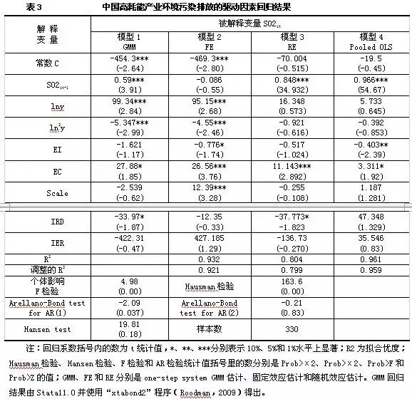 進行回歸。由于系統(tǒng)GMM估計相對差分GMM估計有著更好的有限樣本特征,且估計結果更加有效,因此我們主要使用系統(tǒng)GMM方法進行估計。為了驗證工具變量有效性,我們將采用Sagan/Hansen檢驗及AR檢驗(Arellano-Bond test for AR)進行判斷,在Sargan/Hansen檢驗中,原假設為工具變量有效;在AR檢驗中,殘差項允許存在一階序列相關,但不允許存在二階序列相關。動態(tài)面板GMM估計又可以分為一步和兩步GMM估計。由于兩步估計的標準差存在向下偏倚,這種偏倚經(jīng)過Windmeijer(2005)調整后會減小,但會導致兩步GMM估計量的近似漸進分布不可靠,所以在經(jīng)驗應用中通常使用一步GMM(one-step GMM)估計量(Bond,2002),因此本文將采用一步系統(tǒng)廣義矩估計(one-step system GMM)并進行小樣本調整。同時,為了確定影響中國三大區(qū)域高耗能產(chǎn)業(yè)環(huán)境污染排放的不同的驅動因素及其驅動力的大小,本文將對東中西三大區(qū)域的面板數(shù)據(jù)進行靜態(tài)面板估計(由于分區(qū)域以后N≤T,GMM估計在小樣本下無效)。