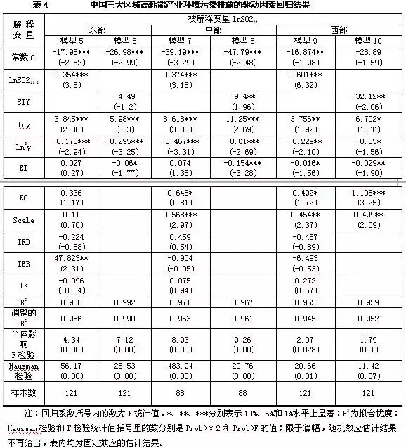 表4給出了三大區(qū)域高耗能產(chǎn)業(yè)污染排放驅動因素模型的回歸結果。在表4的模型中,我們將lnSO2it作為因變量,一是為了考察其不同的經(jīng)濟意義,二是為了更加準確地比較三大區(qū)域在造成環(huán)境污染排放上驅動力差異。模型5描述了東部地區(qū)高耗能產(chǎn)業(yè)環(huán)境污染排放驅動因素的估計結果。我們發(fā)現(xiàn)在東部地區(qū),上一期的SO2排放對本期的SO2排放同樣具有累積作用,這說明東部地區(qū)的SO2排放依然是一個連續(xù)的調整過程。而人均產(chǎn)出的一次項和二次項依然在1%的水平上顯著,這說明在東部省份,EKC假說依然成立,即隨著經(jīng)濟的快速增長,東部高耗能產(chǎn)業(yè)的環(huán)境污染排放呈現(xiàn)出顯著的先增長后減少的態(tài)勢。值得關注的是東部地區(qū)的環(huán)境管制強度與SO2排放呈顯著的正相關,也就是說隨著東部地區(qū)政府環(huán)境管制強度的加大,SO2排放卻依然不減反增。我們認為,這可能與東部地區(qū)的歷史條件和地理位置有關,東部地區(qū)位于沿海地區(qū),在考察期內承接了國外大部分的污染產(chǎn)業(yè)的轉移,從而造成東部地區(qū)SO2排放不減反增的局面。在固定效應模型中,通過觀察東部地區(qū)各個省份的不同的個體影響,也即利用其污染排放量相對于平均排放量的偏離來反映個體環(huán)境污染排放差異。我們發(fā)現(xiàn)山東(1.10)、河北(0.91)的正向偏離值最大,其高耗能產(chǎn)業(yè)的SO2排放量在東部地區(qū)最高;而海南(-1.72)、北京(-1.12)的負向偏離值最大,其環(huán)境污染排放最少,環(huán)境友好程度較高。