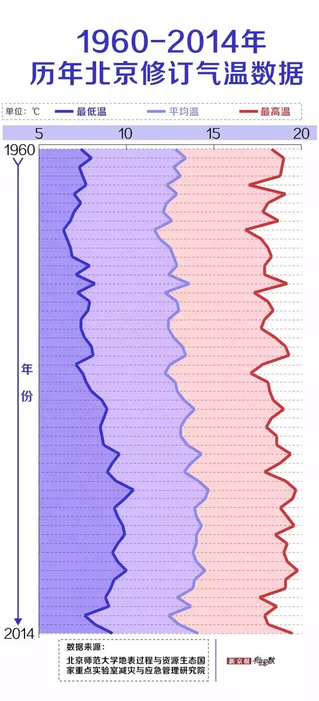 以北京為例,1960-2014年北京市年均溫、年均最高溫和年均最低溫(修訂后數(shù)據(jù))分別從12.8℃、18.3℃和7.4℃上升到14.1℃、19.5℃和9.2℃。這之中,最低溫的增長速率要更快,平均每10年升高0.51℃。