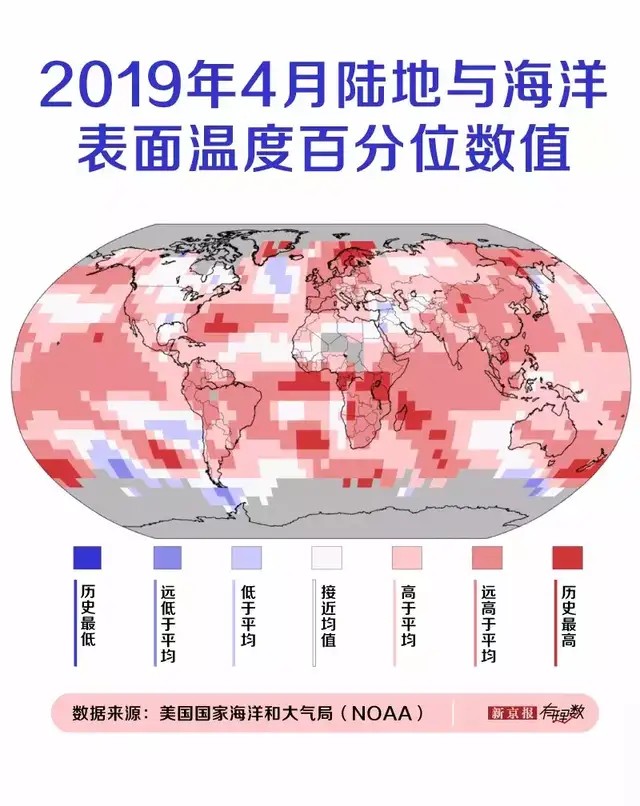 如果用藍(lán)色代表溫度低于平均,用紅色代表溫度高于平均,四月的世界地圖幾乎被紅色填滿。上述報(bào)告指出,格陵蘭島、斯堪的納維亞半島、亞洲北部和中部,四月份陸地和海洋的表面溫度至少要比平均值高出5.4°F。