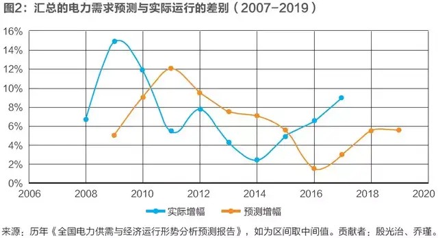 中國電力企業(yè)聯(lián)合會(huì)在近些年均會(huì)發(fā)布過去一年的電力回顧以及新一年的電力展望。卓爾德中心對(duì)這些展望以及實(shí)際的電力增長進(jìn)行了比較。結(jié)果如下??梢钥闯?,僅僅是1年的提前量,其預(yù)期與實(shí)際的差別也可以用“巨大”來形容。