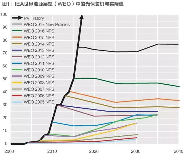 當(dāng)然,這不是我國能源工作者的問題,而是世界各國各機(jī)構(gòu)普遍存在的現(xiàn)象。如圖1所示,國際能源署在10年周期以上的光伏預(yù)測(cè)結(jié)果偏差過大引來NGO組織的苛責(zé)。
