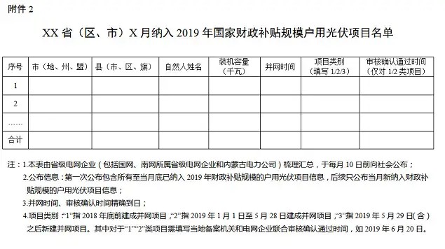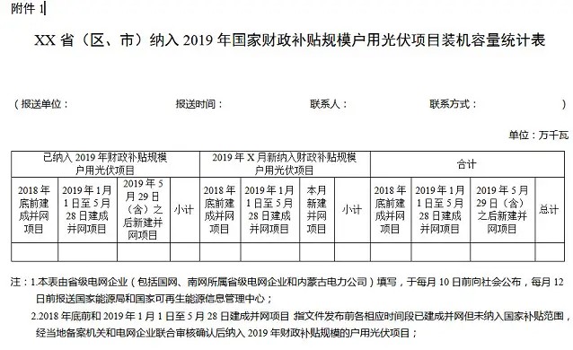 三、請相關(guān)省級能源主管部門組織地方電網(wǎng)企業(yè)于每月8日前按附件1、2向國網(wǎng)、南網(wǎng)所屬省級電網(wǎng)企業(yè)和內(nèi)蒙古電力公司報(bào)送戶用光伏項(xiàng)目信息。各省級電網(wǎng)企業(yè)(含內(nèi)蒙古電力公司)于每月10日前按附件1、2公布匯總后的全省戶用光伏項(xiàng)目信息,并于每月12日前按附件1報(bào)送國家能源局,并抄國家可再生能源信息管理中心。2019年第一次信息公布和報(bào)送從7月開始,以后按月定期公布和報(bào)送信息。