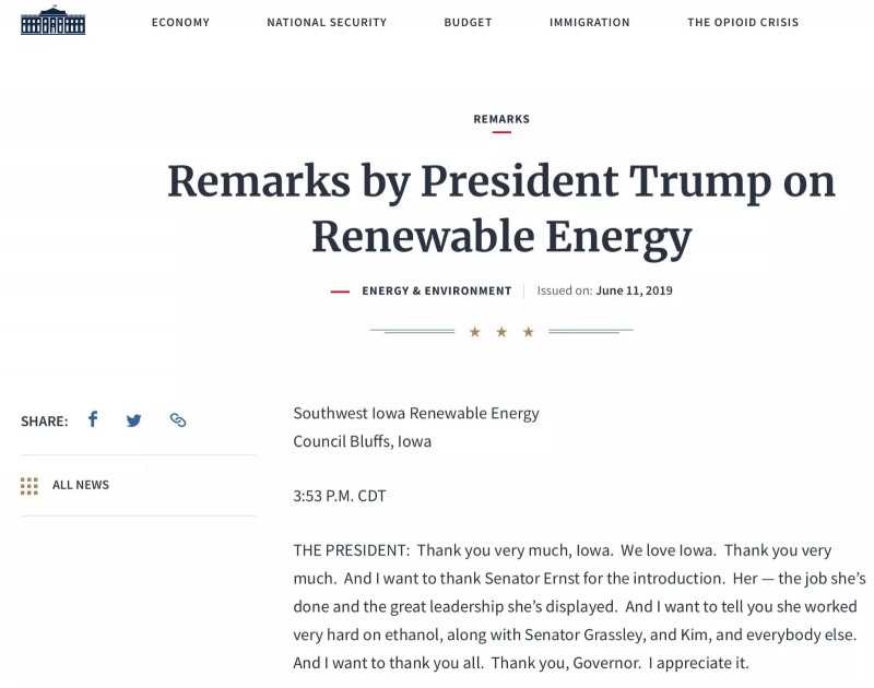 白宮網(wǎng)站貼出特朗普的一篇講話,題為“特朗普總統(tǒng)關(guān)于可再生能源的講話“(Remarks by President Trump on Renewable Energy)。這是6月11日特朗普在艾奧瓦州對(duì)當(dāng)?shù)卣?、農(nóng)業(yè)領(lǐng)域人士的講話,名為”可再生能源“,卻只字不提風(fēng)電、光伏或者水電、地?zé)?,通篇都是生物乙醇。特朗普講話部分內(nèi)容如下: