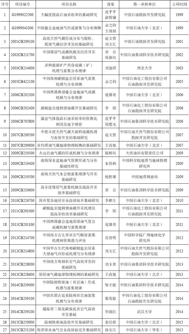 表1 國(guó)家973 計(jì)劃油氣行業(yè)立項(xiàng)清單
