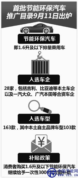9月11日,國(guó)家發(fā)改委網(wǎng)站公布了“節(jié)能產(chǎn)品惠民工程”節(jié)能環(huán)保汽車(1.6升及以下乘用車)推廣目錄(第一批)。入選首批目錄的車企共計(jì)28家,其中既有吉利、比亞迪等本土車企的身影,也不乏一汽大眾和廣汽本田等合資車企,入選的車型達(dá)163款,其中本土自主品牌車型達(dá)103款。這意味著消費(fèi)者未來在購(gòu)買目錄中所涉及的車型時(shí),可享受3000元的優(yōu)惠補(bǔ)貼。