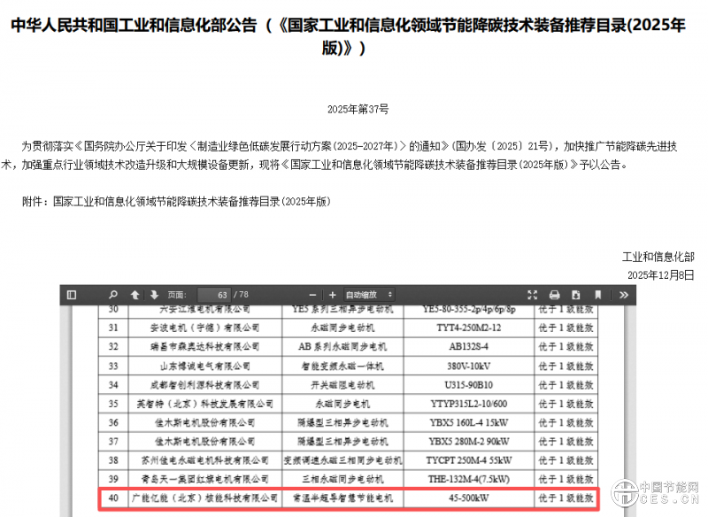 近期,《國家工業(yè)和信息化領域節(jié)能降碳技術裝備推薦目錄(2025年版)》公布,廣能億能(北京)核能科技有限公司的“常溫半超導智慧節(jié)能電機”,憑借出色的產(chǎn)品性能和優(yōu)于國家1級能效的優(yōu)勢成功入選該目錄。
