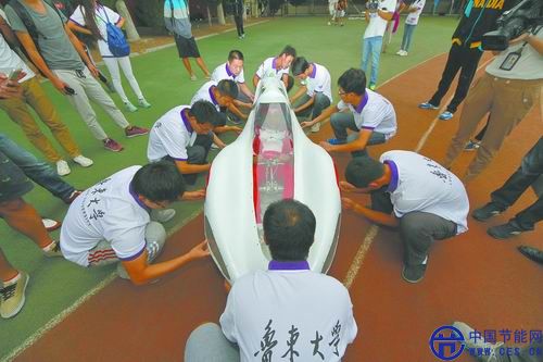 當天,魯東大學車輛工程專業(yè)學生制造的節(jié)能汽車,在測試運行中取得了百公里僅耗油0.4升的成績。該車由學生手工打造,使用一臺本田125cc發(fā)動機,采用一級同步帶傳動系統(tǒng)。車體采用仿水滴流線型設計,風阻系數(shù)低于0.2。車身材料主要使用樹脂和玻璃纖維,使得車輛自重僅為50千克。