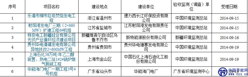 環(huán)保部近日根據(jù)建設(shè)項目竣工環(huán)境保護驗收管理有關(guān)規(guī)定,2014年9月15日—2014年9月19日我部共受理6個建設(shè)項目竣工環(huán)境保護驗收申請。其中6個都是電力項目:5個火電項目,一個光伏發(fā)電項目。