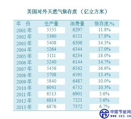 美國是世界上最大的天然氣生產(chǎn)國,也是最大的天然氣消費國,2013年美國天然氣進口仍然占全球的7.88%,屬于最大的進口國之一。美國頁巖氣開采成功,使其對外天然氣依存度呈現(xiàn)逐年降低的趨勢,但在2013年又有所抬頭,見表。