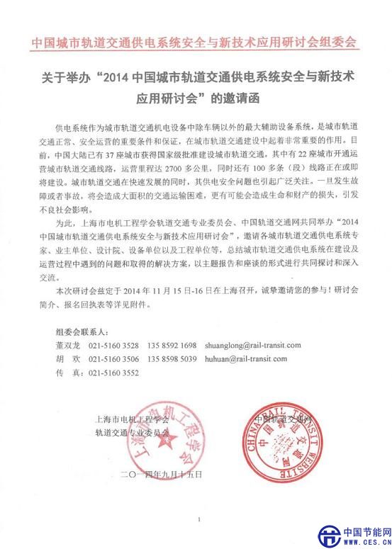 關(guān)于舉辦“2014中國城市軌道交通供電系統(tǒng)安全與新技術(shù)應(yīng)用研討會”的邀請函