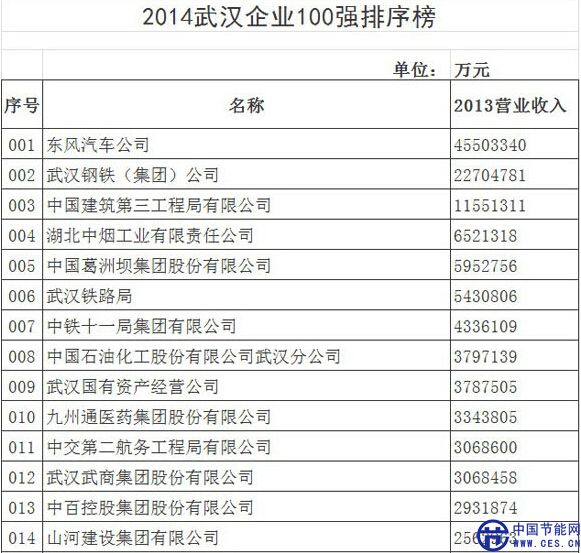 2014武漢企業(yè)100強(qiáng)排行榜名單公示如下: