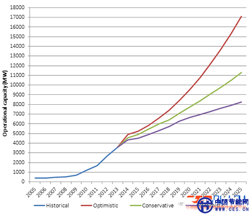 但人們對光熱發(fā)電技術(shù)的信心在顯著增強(qiáng),據(jù)海外光熱發(fā)電信息研究機(jī)構(gòu)CSPToday預(yù)測,在未來十年內(nèi),全球光熱發(fā)電的運(yùn)行裝機(jī)將在2013年3565MW的基礎(chǔ)上至少翻一倍還多。在悲觀、中立、樂觀三種情景模式猜想下,2025年全球光熱發(fā)電裝機(jī)容量有望達(dá)到8240MW~17100MW的規(guī)模。