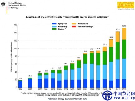 可再生能源的這一承諾已經(jīng)不只是修辭。德國已經(jīng)安裝了比其他任何國家更多的太陽能,盡管擁有一個相當(dāng)適中的太陽能資源,該國的風(fēng)能直到最近也是世界領(lǐng)先。圖1顯示了2013年德國安裝的可再生能源系統(tǒng)。