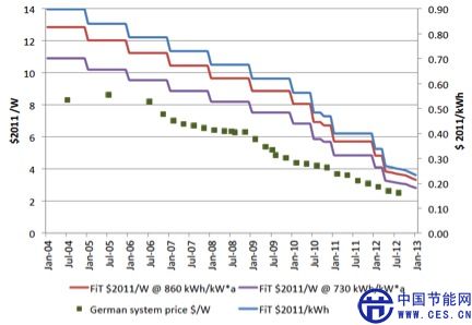 EEG落實上網(wǎng)電價制度的各種技術(shù),價格設(shè)置管理發(fā)展水平被視為必要的刺激。價格自開始以來已經(jīng)下調(diào)無數(shù)次了,設(shè)計一種機制,以促進早期發(fā)展和成本快速下降。圖2顯示了10KW以及低于10KW的太陽能上網(wǎng)電價系統(tǒng)的歷史(利率相較于較大的系統(tǒng)較低,而比其他技術(shù)更低,如風(fēng)能和生物質(zhì)能)。從2004年到2013年上網(wǎng)電價補貼價格下降了74%,其中,如下圖所示,整個系統(tǒng)價格的相關(guān)性非常好(綠色方塊)。