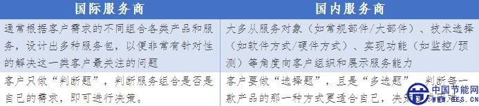 具體到風電運維服務領域,仔細留意不難發(fā)覺當前國內(nèi)主流服務提供商,對服務的包裝和銷售方式仍以產(chǎn)品型為多,體現(xiàn)在命名、宣傳材料構成以及向客戶推介方式等諸多方面。并且,不僅體現(xiàn)在常規(guī)的備品備件、維修、運維等服務領域,在新型服務產(chǎn)品及創(chuàng)新商業(yè)模式的“搶灘戰(zhàn)場”中同樣并不鮮見。而對比國際知名企業(yè),更多的體現(xiàn)為解決方案式的包裝和銷售。例如,對比Vestas的AOM運維服務、GE的風能服務和國內(nèi)廠商對服務能力的介紹,結果顯示如下: