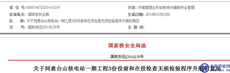 核心提示:近日國家核安全局同意臺山核電站一期工程3份役前和在役檢查無損檢驗(yàn)程序升版的請示。中廣核檢測技術(shù)有限公司:你公司《關(guān)于臺山核電站一期工程