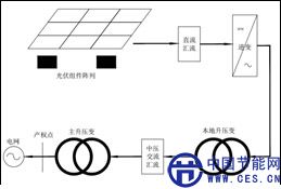 整個(gè)系統(tǒng)主要由光伏方陣和交(直)流輸變電組成,光伏方陣輸出的直流電經(jīng)過直流線路匯流后通過逆變器轉(zhuǎn)變?yōu)椴ㄐ我?guī)則、頻率穩(wěn)定的交流電,然后就地進(jìn)行一次升壓到中壓后,在中壓交流線路上進(jìn)行匯流后再進(jìn)行二次集中升壓,最后接入電網(wǎng)進(jìn)行并網(wǎng)。